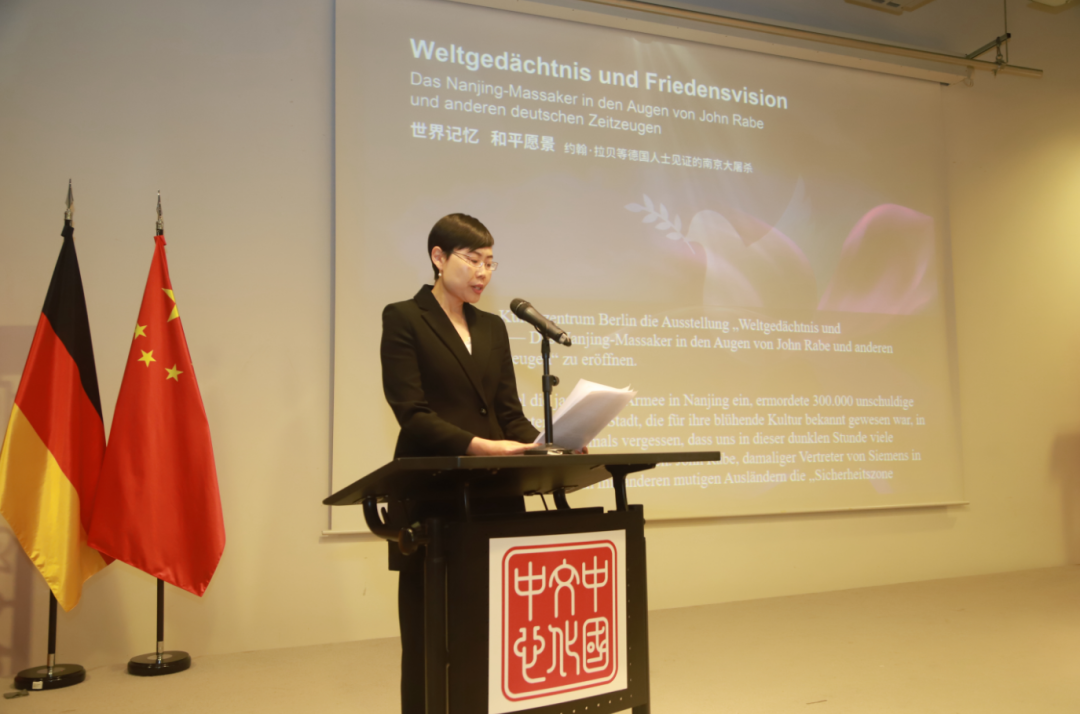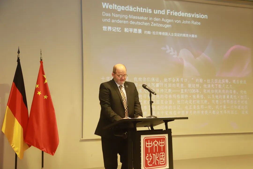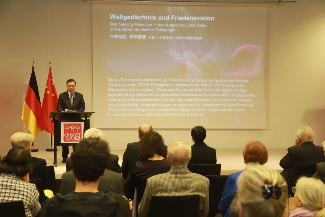 中国驻德国大使馆公使衔参赞杨琤琤在致辞中表示:“中国人民始终没有忘记拉贝先生对生命的大爱和对和平的追求,与拉贝家族的情谊跨越百年延续至今。和平来之不易,历史不容忘记,应共同铭记历史,携手面向未来,做正确历史记忆和人类良知的守护者,做友谊与合作的推动者,使和平与正义的薪火代代相传。”