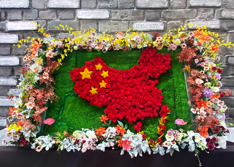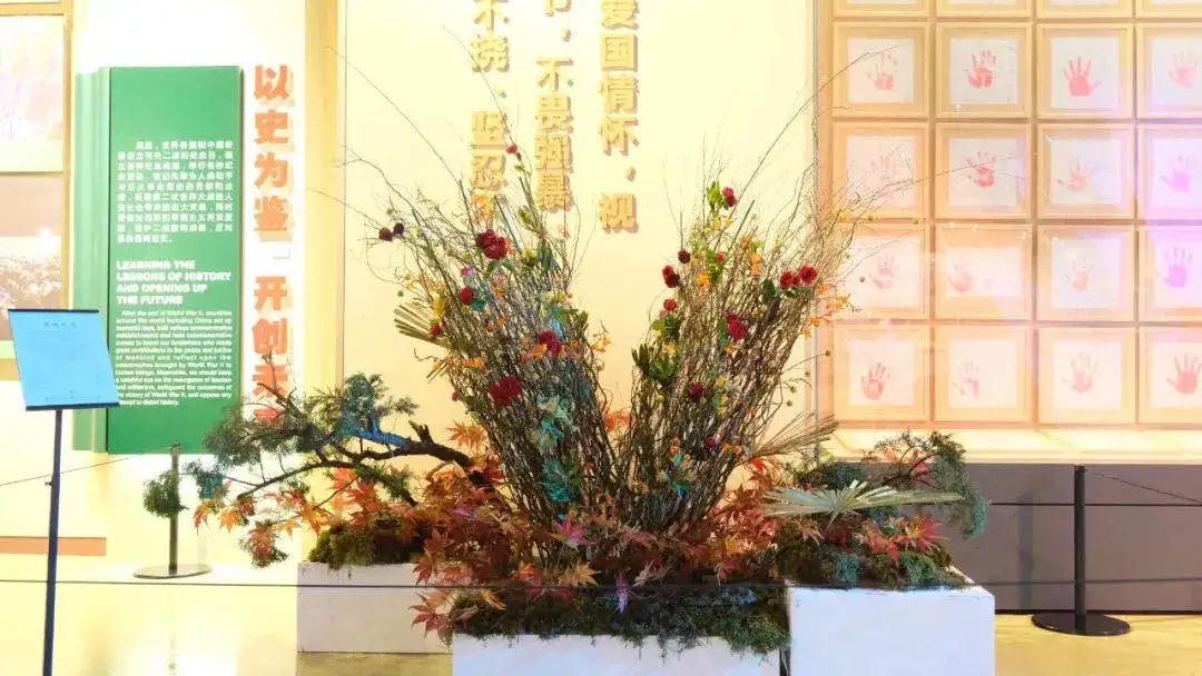 8月15日日本宣布无条件投降:将荆棘做主体创作,荆棘中融入日本于 1945年 9 月 9 日签署的《降书》文创品,表达战争的残酷、抗战历程的艰险。配以象征生命力、意志力、团结之意的花材,表达战争中中国人民团结一心,自强不息的民族精神。展台边创作大型瓶花作品配以装置艺术,插作 75 朵菊花,表达75 年来不忘对遇难同胞的祭奠,对英烈的致敬,以及对和平的永久祝愿。