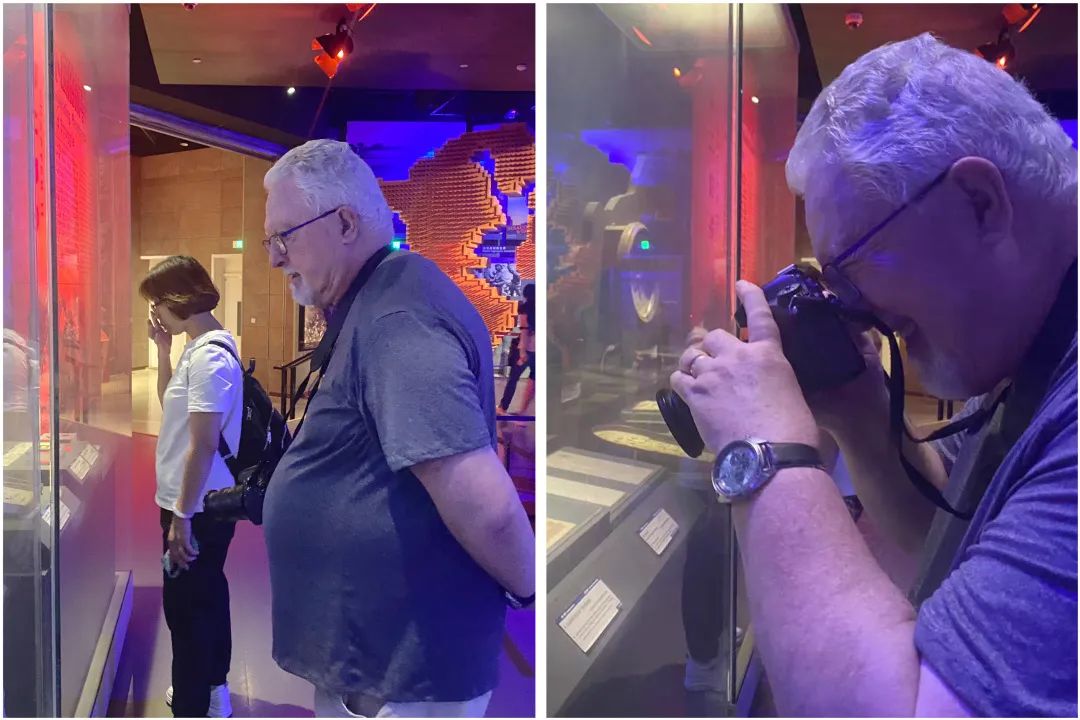 来自法国的Quezede和儿子、中国儿媳、孙女一同来到纪念馆“三个必胜”展厅参观。在参观过程中遇到感兴趣的文物和历史照片时,Quezede都会拿起相机拍摄记录。