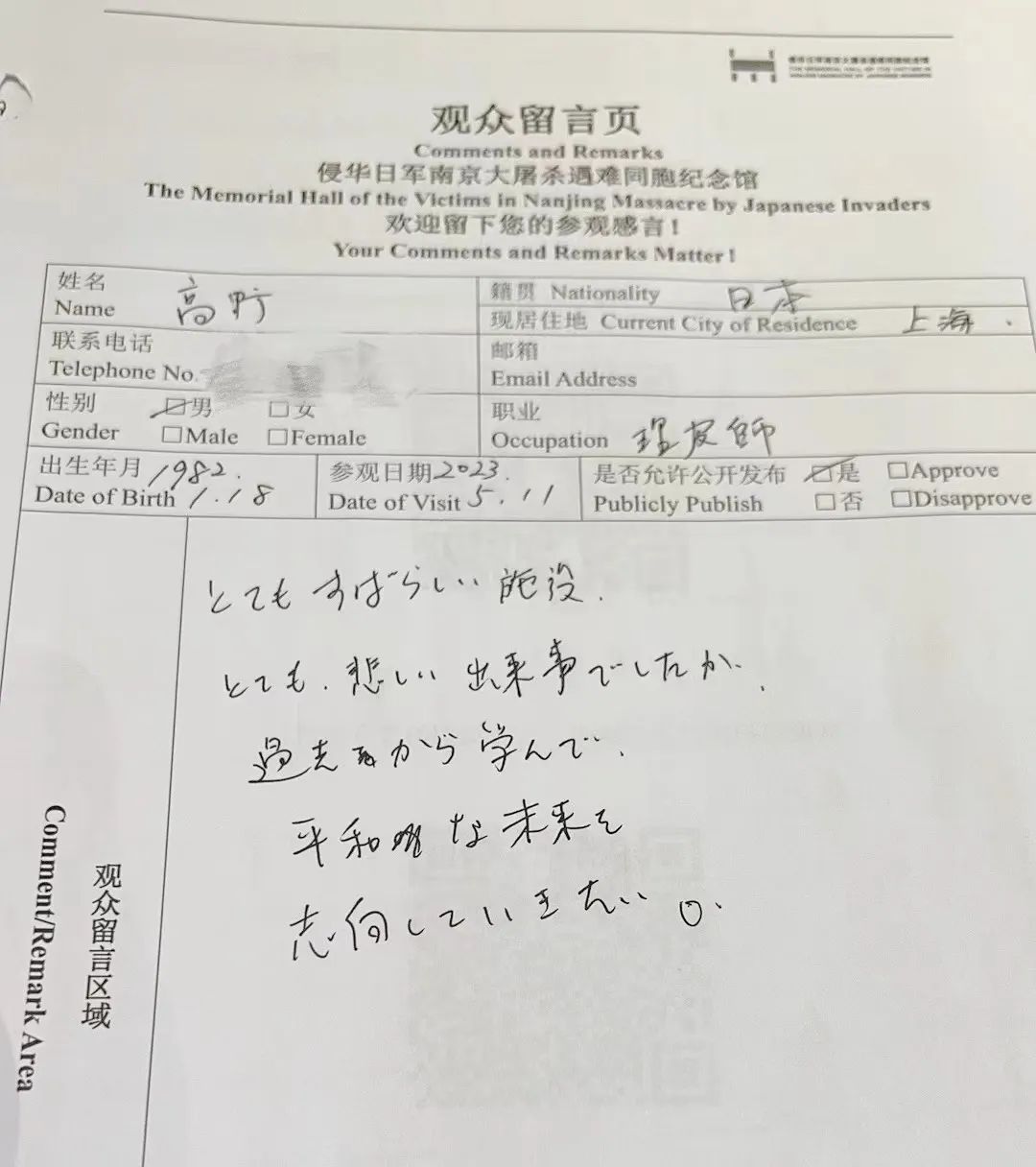 一位日本观众在参观后写道:“这里有着非常优秀的展陈设施。这是一段很悲伤的历史,我希望吸取过去的教训,面向和平的未来。”