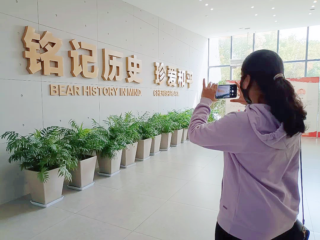 在史料陈列厅的尾厅,一位来自印度的女生S.Vaishnavi用手机拍下“铭记历史 珍爱和平”。她说,来中国前不知道南京大屠杀历史,“我感到这段历史太残忍了,让人感觉太悲伤了。参观纪念馆时我拍了照片,想带回去告诉我的家人在这里的所见所闻,并且告诉我身边的年轻人,珍惜来之不易的和平。”