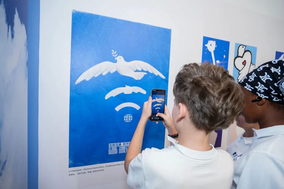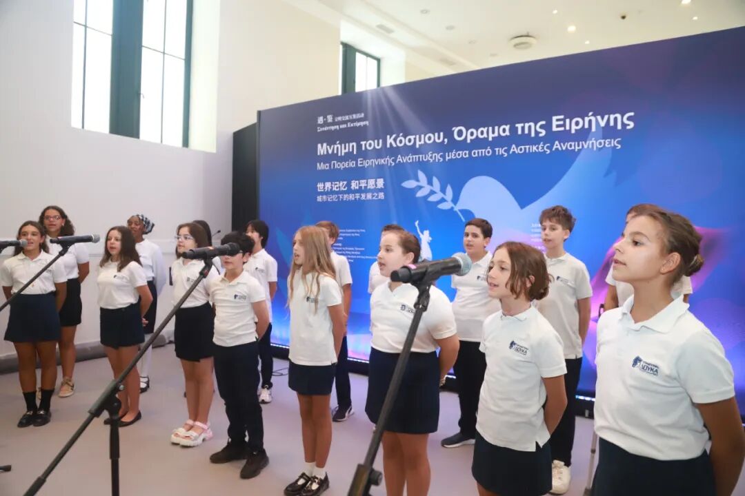活动伊始,未来世界中希青少年团体合唱希腊民谣组曲《如果全世界的孩子们》《像这样的手》以及中国歌曲《让世界充满爱》,清澈的童声回荡在展厅内,为现场营造了庄重而充满希望的基调。
