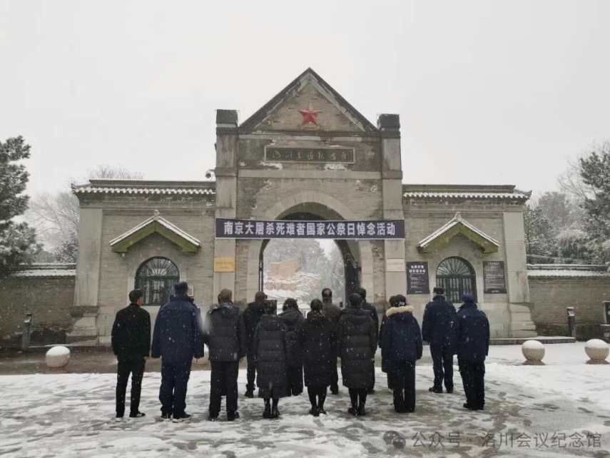 河南洛阳。八路军驻洛办事处纪念馆在南院党旗前举行南京大屠杀死难者国家公祭日悼念活动。全体人员高唱国歌,向死难者默哀、献花。志愿者代表朗诵抗战主题诗歌《烽烟的年轮》,回顾苦难岁月,铭记历史,展望未来。