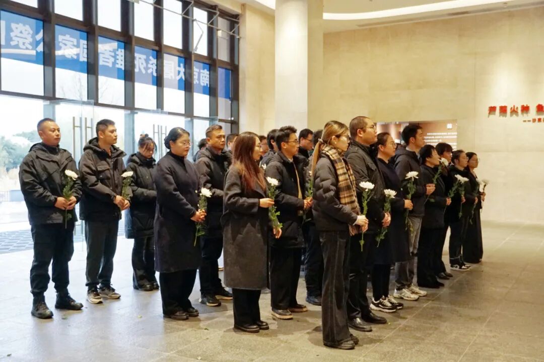 广东东莞。广东东江纵队纪念馆在纪念馆前广场举行南京大屠杀死难者国家公祭日同步悼念活动,形成了跨越时空的历史共鸣。来自粤港澳大湾区的党员代表、大学生、小学生及社会各界人士共400余人手持菊花,整齐肃立,共同参与这场缅怀历史、祈愿和平的仪式。东莞城市学院的学生代表诵读《和平宣言》,各界代表缓步走向题字碑墙,敬献鲜花。仪式结束后,全体人员参观基本陈列“东江铁流 南粤旌旗”。