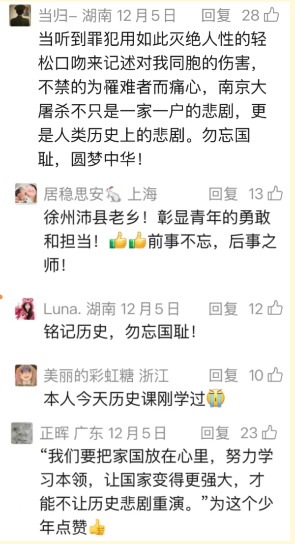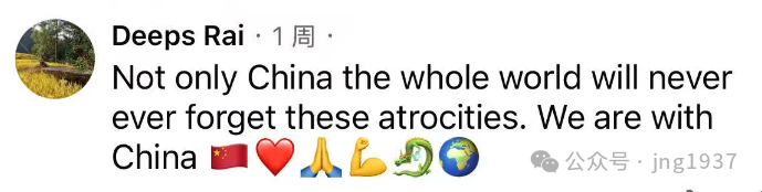 网友留言:“不只是中国,全世界都永远不会忘记这些暴行。我们与中国人民同在。”