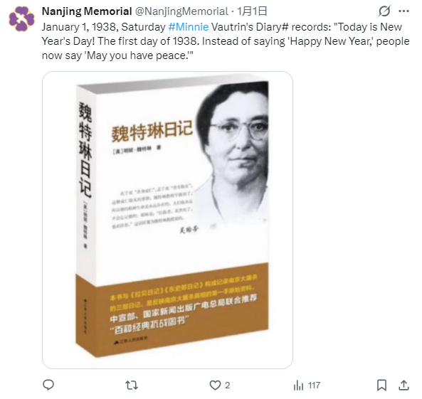 我馆海外社交媒体账号发布1938年1月1日《魏特琳日记》
