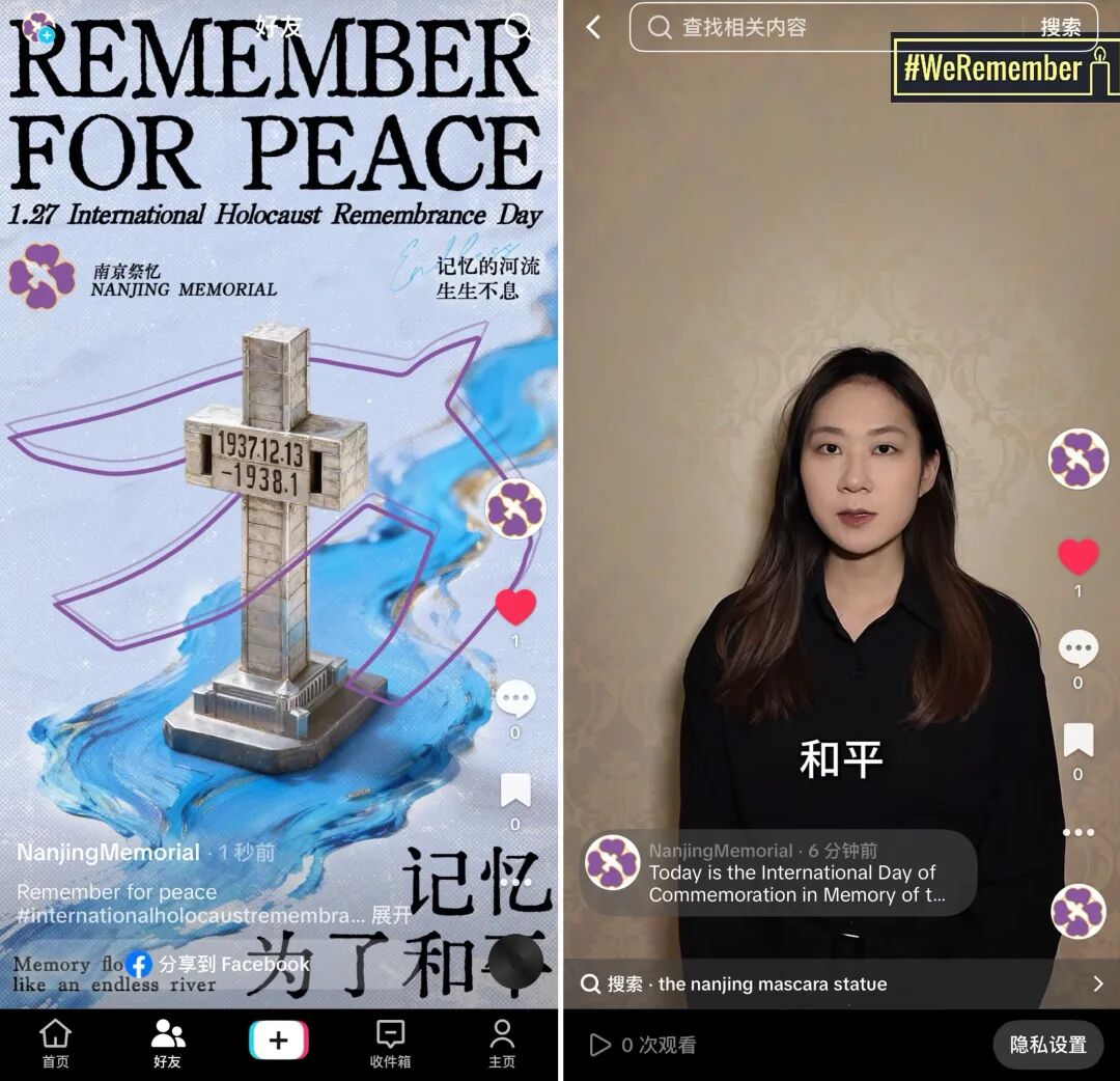1月27日,缅怀大屠杀遇难者的国际纪念日,纪念馆海外账号“Nanjing Memorial”正式入驻TikTok,这是继 Facebook、X后纪念馆入驻的第三个海外社交媒体平台。