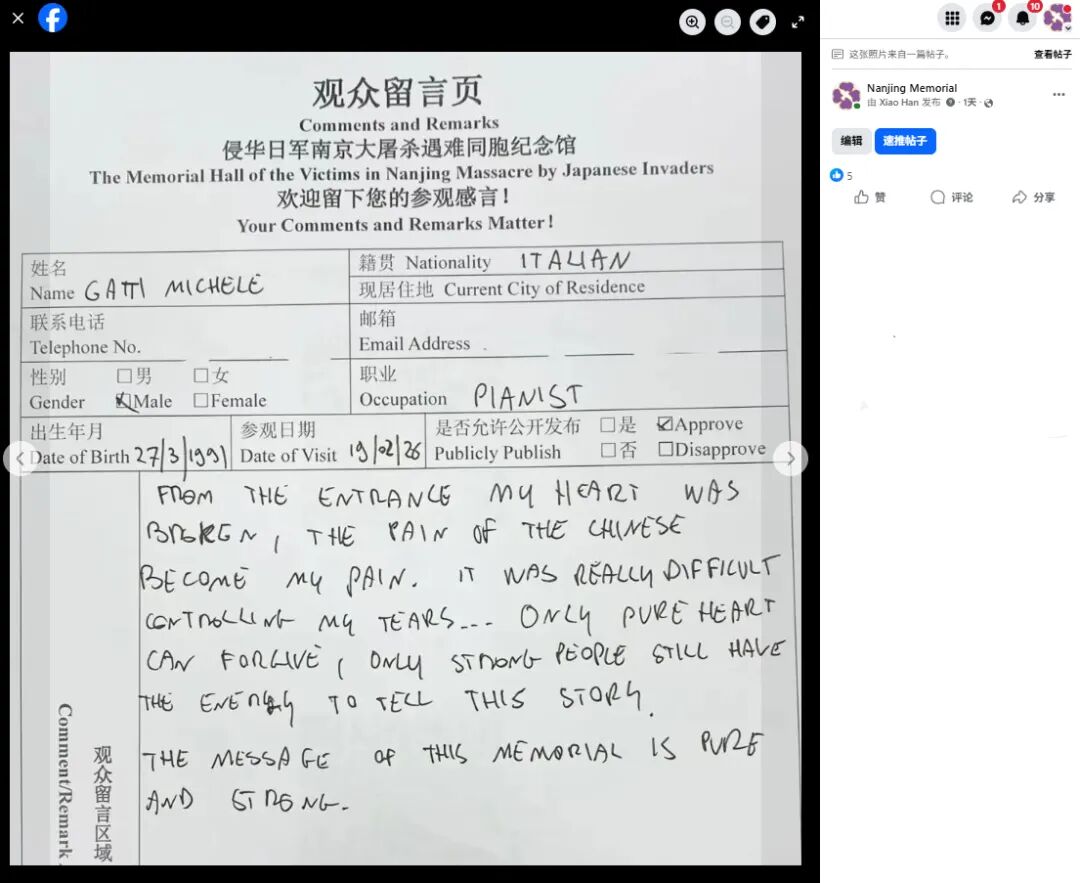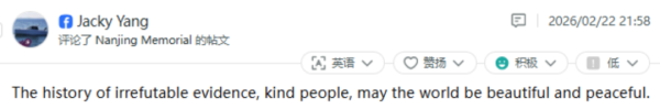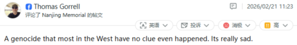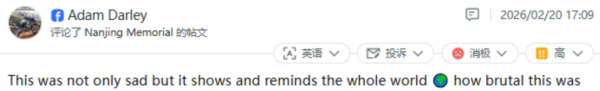 国外网友留言:“我从中国配偶那里了解到南京大屠杀,我感到极度震惊,我从来没有被教过这段历史。日本政府至今仍在争论、淡化这段历史,这本身就很能说明问题。”