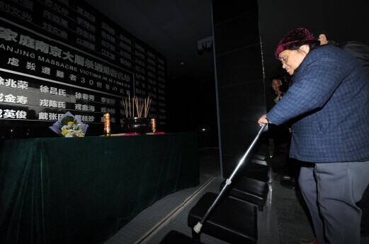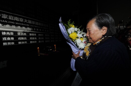遭難者遺族夏淑琴氏が南京大虐殺で遭難した親族に線香を供え、花を捧げる