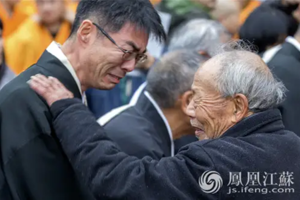 On the afternoon of December 13, 2016, a Japanese friendly personage cried and apologized to Jin Maozhi, a survivor of the Nanjing Massacre. The elderly Jin Maozhi patted his shoulder and said that only peace can bring happiness to the people.