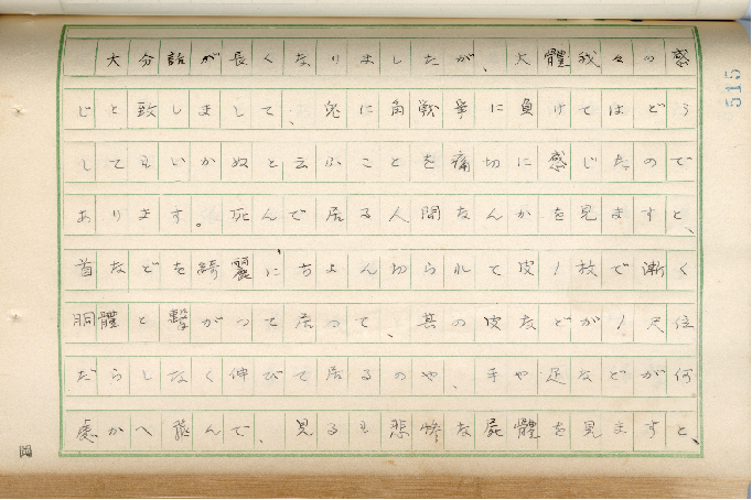 The diary also notes Eisaku Saijo arrived in Nanjing on December 31, 1937, where he witnessed the aftermath of the massacre. He wrote in his diary on January 1, 1938, “After breakfast, under the command of the squad leaders, we went into Nanjing for a tour of the city. After wandering around, on the way back we took the wrong turn and arrived at Hanzhong Gate. We kept walking along the city wall for about eight kilometers, and then went back to our quarters, when it was already after five PM. What shocked me most was the mountain of corpses by the river outside the city....”