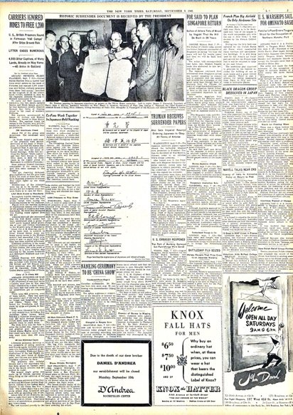 On September 8, 1945, The New York Times reported on the scene of September 2, 1945, in which Shigemitsu Mamoru and Umezu Yoshijiro, representing Japan, unconditionally surrendered aboard the battleship USS Missouri to representatives of various countries, including China’s Xu Yongchang.