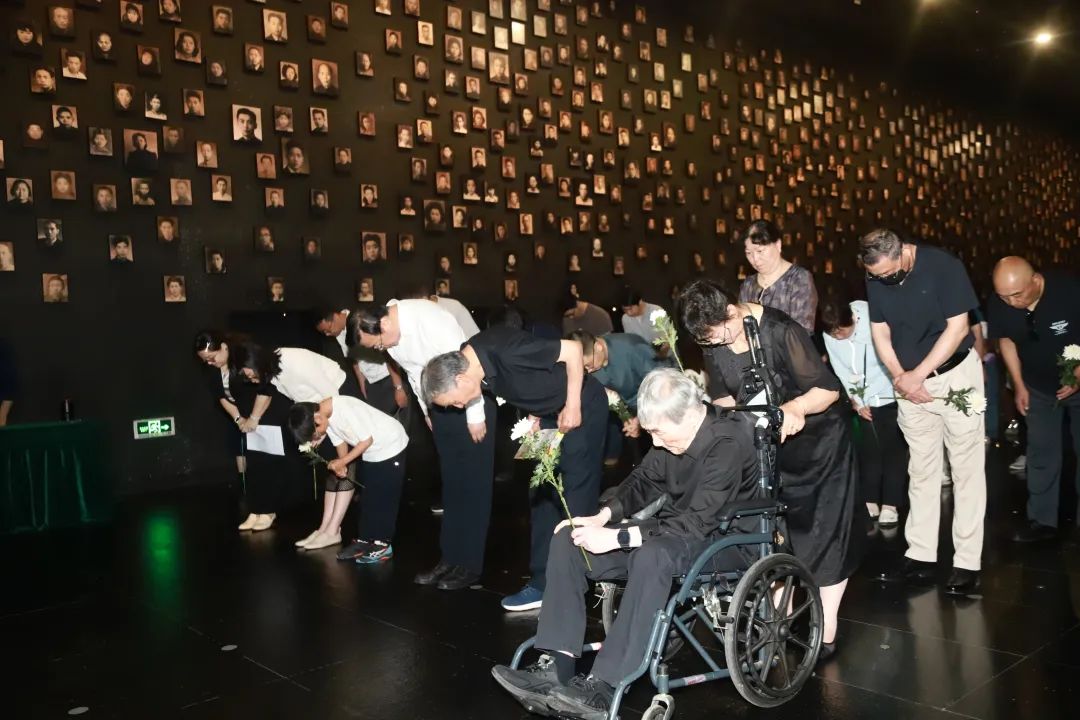 On the morning of July 2, the Memorial Hall held a lamp-extinguishing ceremony in front of the photo wall of Nanjing Massacre survivors to honor Liu Guixiang and Xie Guiying, two survivors who had recently passed away. The photos of the two deceased survivors gradually transitioned from color to black and white. All attendees held white chrysanthemums and paid solemn tribute by bowing three times before the portraits of the departed survivors.