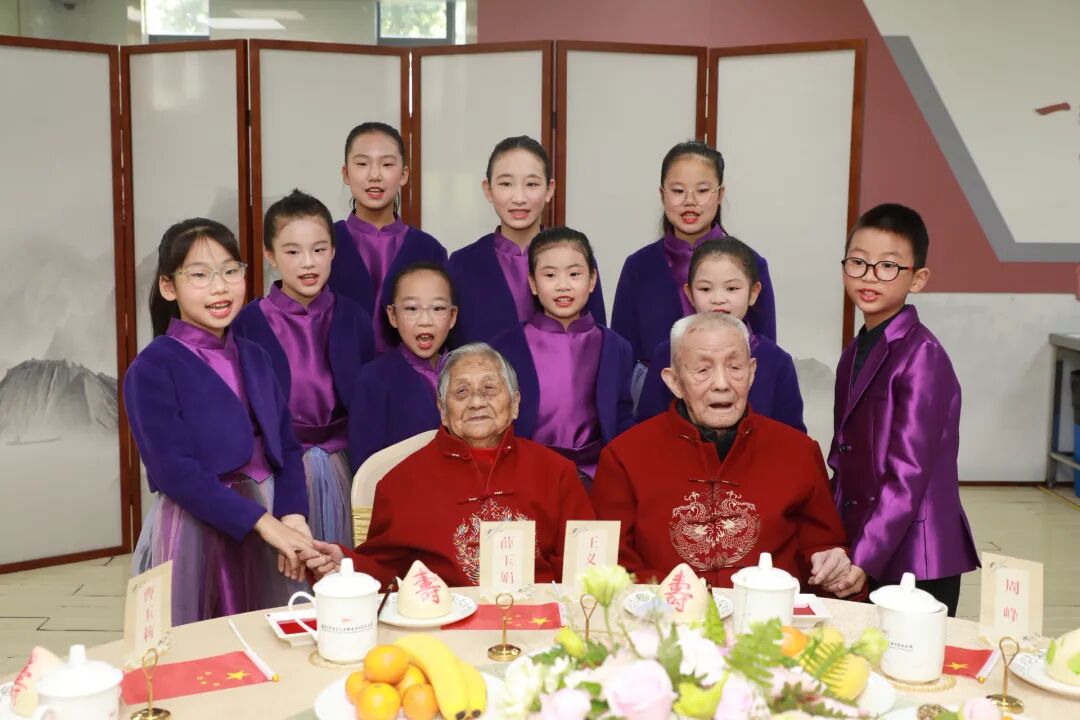 王义隆、薛玉娟是目前最年长的幸存者。幸存者的百年人生,是一部与民族命运紧密交织的史诗。他们以坚韧的生命力量,亲历并见证了中华民族从沉沦到奋起的伟大跨越,他们既是南京大屠杀历史的“活证人”,更是中国人民抗日战争胜利的“见证者”。两位老人与家属、纪念馆工作人员围坐一堂,紫金草童声合唱团以《和平的童谣》拉开寿宴序幕。当《我和我的祖国》旋律响起,两位老人挥舞小国旗,眼中闪烁泪光。